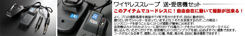 | シンクロコードを使うことなくストロボ撮影が簡単に出来ます! 送信機はカメラのホットシューに取り付けて付属のコードをカメラのシンクロターミナルに差し込んでいただくだけです。受信機もストロボピンプラグを差し込めばすぐに撮影できます。 使用する電池は送信機が23Aアルカリ電池(本体に付属)・受信機側は単4型電池(別売り)となります。 また、軽量コンパクトな設計になっていますので、持ち運びも簡単ですし機材に負担をかけることが少なくて済みます。 使用周波数は、国内仕様可能な315MHz帯周波数を使用しています。 こちらの商品は4チャンネル式になっておりまして、送信機と受信機のスイッチを同じ位置にセット頂くだけですのでセットも簡単です。 また受信機が複数あれば複数のストロボへの使用も可能です(最大4台まで) 受信機のピンコードは変換コネクターも付いていますので、色々なタイプのものに対応しています。 変換コネクターは楽器やさんでも購入可能です。 シンクロコードはもう不要です!! |